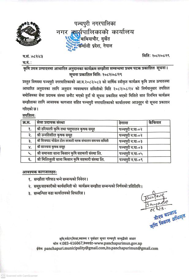 कृषि उपज उत्पादनमा आधारित अनुदानका कार्यक्रम सम्झौता सम्बन्धी सूचना ।