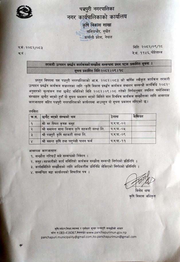 तरकारी प्रवर्द्धन कार्यक्रमका लागि सम्झाैता गर्ने सम्बन्धी सुचना ।