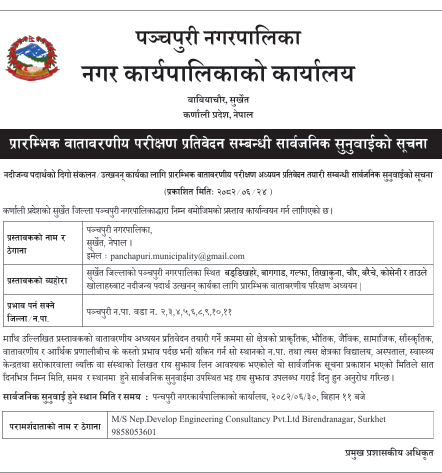 प्रारम्भीक वातावरणीय परिक्षण प्रतिवेदन सम्बन्धि सार्वजनिक सुनुवाईको सुचना ।