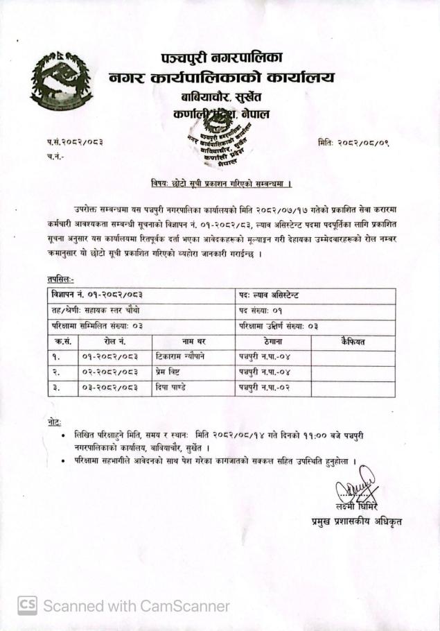 ल्याव असिष्टेन्ट पदको छोटो सूची प्रकाशन सम्बन्धमा ।